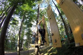 In unserem Seilgarten erwarten dich 3 Niederseilparcours, 9 Hochseilparcours und jede Menge Seilrutschen [von ‚Pipileicht‘ bis ‚Hose voll‘].